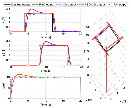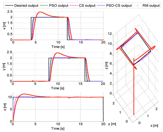Quadrotor’s positions (x, y, z) using Particle Swarm Optimization (PSO), Cuckoo Search (CS), Particle Swarm Optimization-Cuckoo Search (PSO-CS), and Reference Model (RM) (rectangular trajectory).