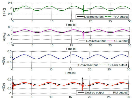 Quadrotor’s roll attitude (ϕ) using Particle Swarm Optimization (PSO), Cuckoo Search (CS), Particle Swarm Optimization-Cuckoo Search (PSO-CS), and Reference Model (RM) with disturbance (helical trajectory).