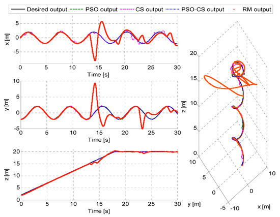 Quadrotor’s positions (x, y, z) using Particle Swarm Optimization (PSO), Cuckoo Search (CS), Particle Swarm Optimization-Cuckoo Search (PSO-CS), and Reference Model (RM) (helical trajectory).