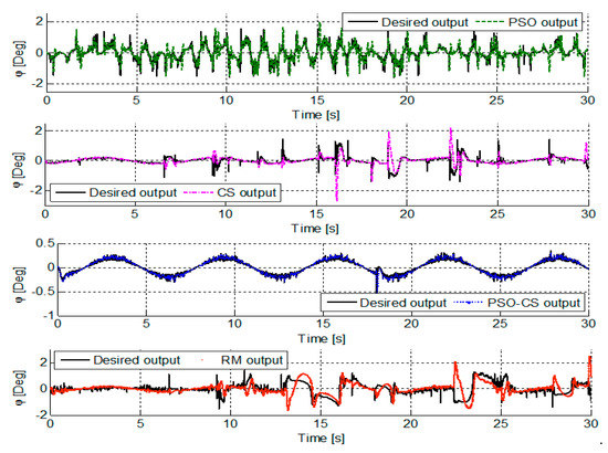 Quadrotor’s roll attitude (ϕ) using Particle Swarm Optimization (PSO), Cuckoo Search (CS), Particle Swarm Optimization-Cuckoo Search (PSO-CS), and Reference Model (RM) (helical trajectory).