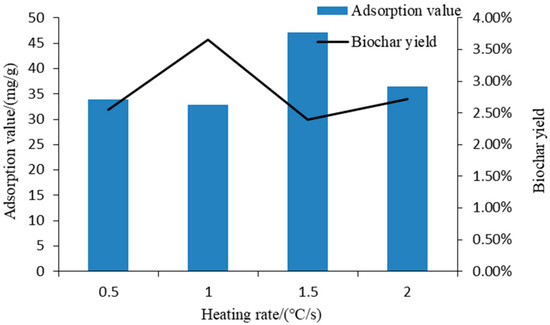 As shown in Figure 4, the biochar yield reached a peak of 3.66% when the heating rate was 1 °C/s. The adsorbability of the biochar reached its highest value of 47.114 mg/g when the heating rate was 1.5 °C/s. However, at other heating rates, the biochar yields were close to 2.50%, and adsorbing capacities of biochar were close to 35 mg/g. It may suggest that when the heating rate was low, the reaction speed and the gas production yield were also low. The gas production could not release in time, thus the probability of a secondary reaction increased, and the biochar yield was low. On the contrary, when the heating rate was high, the reaction speed was also high. The gas could not release in time, which increased the probability of the initiation of a secondary reaction. Though the secondary reaction could improve the adsorbability of the biochar, the low heating rate leads to a low gas production yield, thus the quality of the biochar was poor [19]. However, when the heating rate was high, the reaction speed was also high, and the gas products might release in a short time, thus the biochar structure was irregular, and thus resulted in poor adsorption.