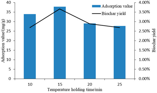 The biochar yield and adsorbability both increased when the temperature holding time was increased, reaching the highest value at 15 min. Then they both decreased when the holding time was longer than 15 min.