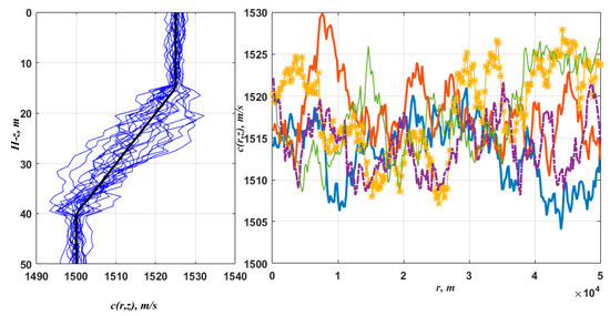 Random shallow water waveguide. The left graph: r=19900 m, 20 random realizations of a sound speed profile from the ensemble of 1000. The right graph: 5 random realizations of a sound speed profile along the propagation path at the horizon H-z = 25 m.