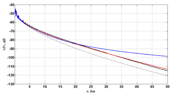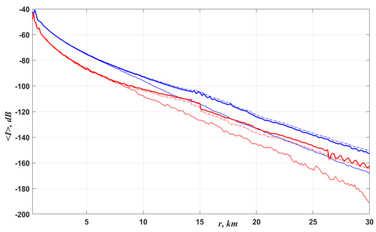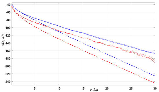 Figure 3 shows that the slowdown in the decay of the average intensity is manifested already at fairly close distances of 8–10 km from the source, and to a distance of 30 km it reaches 20–23 dB.