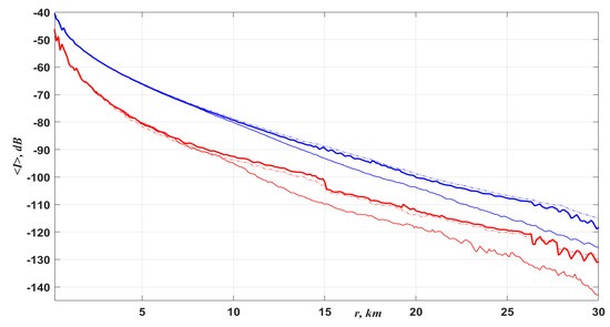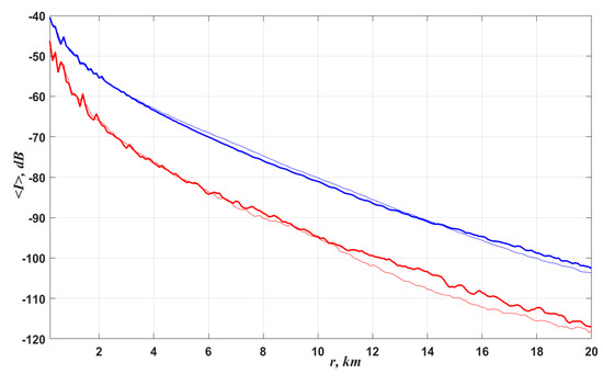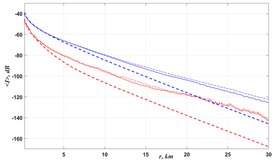 In Figure 5 for two horizons, the transmission losses are presented in a waveguide with Gaussian fluctuations, as in Figure 3, and with fluctuations of the form (14) using the telegraph random process ε2(r) described above. It is clearly seen that the telegraph process noticeably underlines the weakening of the decay of the average intensity in the waveguide. The corresponding curves begin to diverge at r > 8–10 km, and the loss attenuation to 30 km, caused by the difference in the fluctuation field from the Gaussian one, is 10 dB or more. In this case, the curves become somewhat more cut due to the discontinuous nature of the telegraph process ε2(r). For a waveguide with a “soft bottom” (Figure 6), the picture is similar, only the discrepancy with Gaussian average intensity curves increases towards attenuation of propagation losses to a distance of 30 km, additional attenuation is 20 dB or more for different observation horizons.