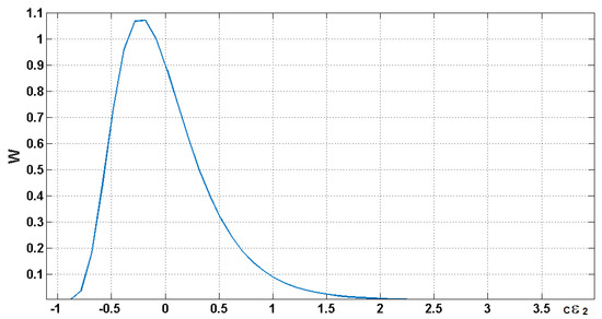 The following example demonstrates the situation with a log-normal probability distribution of the fluctuations ε2(r). Log-normal distributions are quite often encountered in statistical wave problems [2,33]. Main feature of the such distribution in comparison with Gaussian one is the asymmetry and the presence of slowly falling tails, which leads to the appearance in the ensemble of random realizations of rare but strong emissions in intensity. The probability density of the generated process ε2 is shown in Figure 7. As before, ε2 has zero mean value and is described by an exponential correlation function. The median of the distribution is non-zero, but the distribution parameters are chosen so that the fluctuations are adequate in intensity to those observed in the experiment and correspond to the values described above. As applied to the propagation of low-frequency sound on the sea shelf, log-normal fluctuations in the speed of sound can be viewed as the result of the influence of transient hydrodynamic perturbations leading to the formation of background internal waves (formed on the tails of numerous collapses of nonlinear internal waves), which are commonly described by Gaussian processes.
