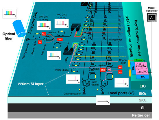 - Zecevic, N.; Hofbauer, M.; Goll, B.; Zimmermann, H.; Tondini, S.; Chalyan, A.; Fontana, G.; Pavesi, L.; Testa, F.; Stracca, S.; et al. A 3D Photonic-Electronic Integrated Transponder Aggregator With 48 × 16 Heater Control Cells. IEEE Photonics Technol. Lett. 2018, 30, 681–684. [Google Scholar] [CrossRef]