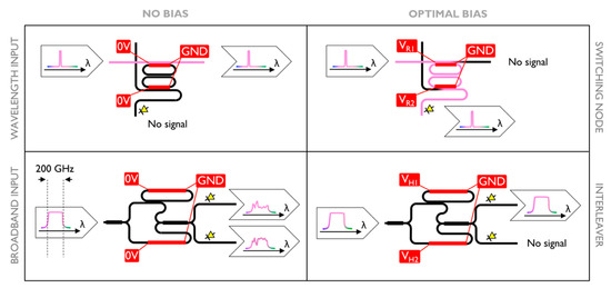 The IRIS switch has a cross-bar topology, which is the most appropriate switch fabric for a multi-port switch, where the loss values of the switching elements in both the off- and on-state must be as low as possible [17]. In Figure 1 (left), a comb of 12 WDM channels (200 GHz spacing) reaches one of the four fiber-pigtailed input ports of the chip. At the input port, the optical signal is coupled into the photonic chip, through a single polarization grating coupler (SPGC). A multi-wavelength waveguide leads the signal to a de-interleaving stage (interleavers), which separates the channels into odd and even wavelengths (spacing relaxed to 400 GHz) [18]. Then, the two subsets of wavelengths move toward two 1 × 6 AWGs, which take the single optical channels apart into dedicated waveguides [19]. After the de-multiplexing stage, we have the switching matrix, where the double MRR-based switching nodes placed at the waveguide crossings can be trimmed, to drop the signal from each line. In fact, each MRR of the system comes with a dedicated metallic heater, which can be independently biased to shift the MRR resonance by the thermo-optic effect [20,21]. By design, all MRRs are not resonating with the wavelengths carried by the line waveguides (off-state). However, when a specific bias is applied to the heaters of a switching node, it comes in resonance (on-state) and drops the signal from the line waveguide. Thermal crosstalk is negligible. Simulations and experimental results show that, for an MRR in the off state, the thermal crosstalk from adjacent MRRs move the resonance by less than 16 GHz [11]. Integrated photo-diodes placed after each stage, allow for an optimization based on optical feedback. We will describe the optimization method used to find the proper bias values for the two MRRs of a switching node, to drop a wanted wavelength in the next section. Moreover, at the end of Section 5, we will address how to tackle the case of some MRRs that happened to be partially aligned, even though they should be in the off-state by design.