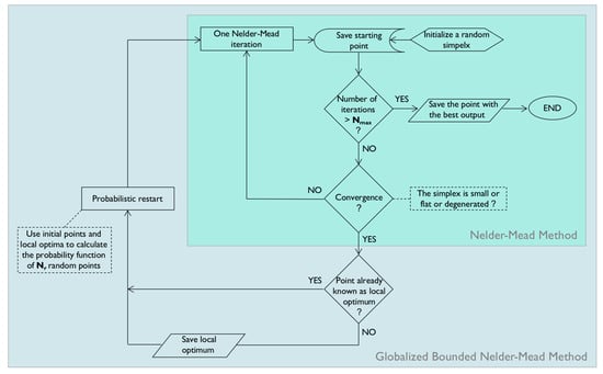 Flow chart of the Globalized Bounded Nelder–Mead method. In the green square, on the top right, a single Nelder–Mead search is represented.
