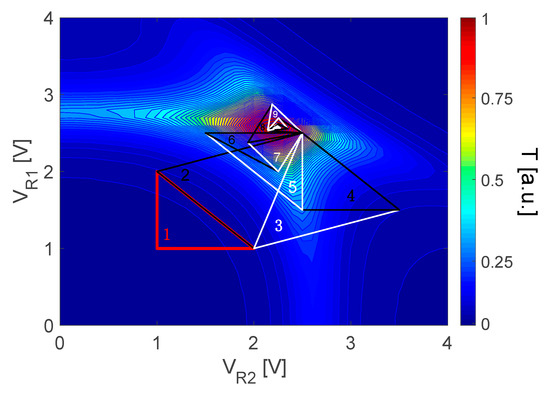 In practice, the target function we needed for optimization was the optical signal at the output of the switching nodes and the interleavers (as sketched in Figure 2). As an example, Figure 4 shows the steps performed in a local NM search, to align one switching node. The contour plot in the background has been obtained by collecting the signal (T) dropped by the switching node at each point of the search domain (i.e., for all of the bias combinations applicable to the MRR heaters). Above the contour, a series of simplexes (triangles) is superimposed, which represent the evolution of the NM optimization. The starting triangle is shown in red, while alternating black and white triangles follow from the different actions toward convergence, namely reflection, expansion, contraction, and shrinkage.