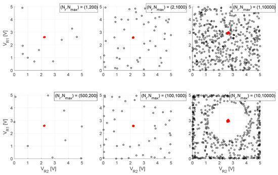 By comparing the upper two plots of Figure 5 we can appreciate how Nr affected the restarts when Nmax was kept constant. If Nr was 1, the re-initialization was completely random because no selection of the best point could be operated when the pool contained a single point (Figure 5 (top left)). If Nr was large (i.e., 500), the starting points come to lie on a lattice (Figure 5 (bottom left)), as this was the geometric layout that minimized the probability density Φ(x). So, Nr should be chosen in such a way to reach a compromise between a random and a grid arrangement. However, it was not crucial to find the best value of Nr for our target function, according to the outcomes showed in Figure 5 (middle panels). In fact, these two conditions were pretty similar and we could ensure a sufficiently broad search within the domain, as well as a limited computational cost of the GBNM algorithm, if we chose Nr ∈ [5;10].