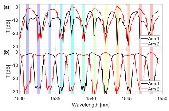Comparison between the transmission spectra of one interleaver, before (a) and after (b) the automatic alignment. The colored slots represent the channels which the device had to be in line with. The signal was normalized to the optical power at the interleaver input. The noise in the measurements was due to the integrated Ge photo-diodes read-out.