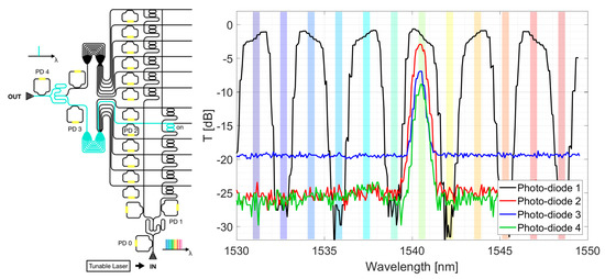 Figure 7 reports the performances measured by the internal photo-diodes after each photonic stage of the IRIS chip. In this case we showed the device operating in the add mode, i.e., the input signal was injected from the local port to be added to one line port, as depicted in the left panel the figure. A tunable laser was used as input light source. The photonic components along the pathway were aligned according to the proposed optimization routine. The curves were normalized to the optical signal collected by the photo-diode, after the input grating coupler (PD 0 in the schematics on the left). As a first step, the light passed through the interleaver. The black curve represented the transmission spectrum at one of the two output arms (PD 1). Notice that the multispectral signal in the input was de-interleaved into the single odd channels. The red curve was acquired after the switching node which was turned to the on-state (PD 2). The MRR-based node accounted for 2 ÷ 3 dB optical losses. The blue curve showed how the AWG affected the transmission, reducing the optical power by another 3 dB (PD 3). The effect of fabrication inaccuracies on AWGs and the possible ways to correct them could be found in [19,33]. Finally, the green curve was collected after the second interleaver, just before the output grating coupler (PD 4).