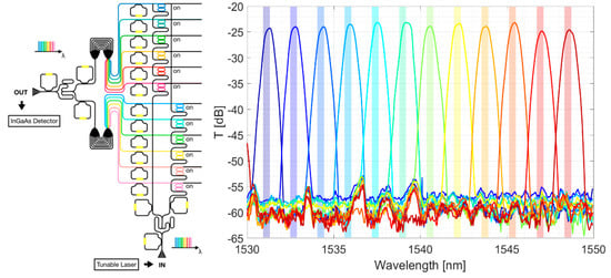 (left) Schematics of the light-paths on-chip when all 12 channels were added to a line port. (right) Channel-output spectra when the optical signal was injected from one local port and collected out-of-chip through an external detector. Each colored curve refers to a separate measurement, where only one wavelength channel at a time is added to the line port.