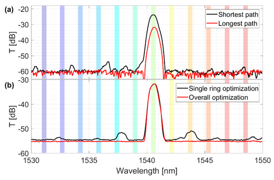 Still in Figure 9a, we can see some side peaks rising form the noise plateau (especially in the black curve). This was due to some MRRs along the optical path which happened to be partially aligned, although all of the switching nodes should have been in the off-state by design, when not biased. This was because of inaccuracies introduced during the fabrication process. We could easily solve this issue by misaligning all of the switching nodes of the IRIS matrix in a preliminary step, before putting the device into operation. Of course this task could be addressed by exploiting the same optimization method discussed in the previous section. In fact, we could simply turn the search into a minimization problem, by looking at lowering the optical signal in the through port of the switching nodes. An example of such an operation is shown in Figure 9b, where a better channel isolation was retrieved after the misalignment of all the switching node but the one in the on-state (red curve). Further measurements demonstrated that similar optimization performances could be achieved in all the other 11 wavelength channels. Clearly, this affected the energy budget needed to switch one wavelength channel, as more electrical power was used to keep the other switching nodes misaligned (about 20 mW per node).