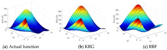 The rapid development of various surrogate models provides researchers with a lot more flexibility while they are selecting models for engineering design problems. However, it is challenging to choose the optimal model for a specific application before all the different surrogate models are constructed []. Since practical engineering applications often exhibit different linear and nonlinear properties, no single surrogate model can exhibit high performance in all scenarios; each surrogate model has advantages and disadvantages [,,,]. The PRS model fits the linear relationship between the inputs and the outputs well, while the KRG and RBF model are more suited for complex nonlinear relationships between the input and output datasets. The SVR model is suitable for both linear and nonlinear relationships between the inputs and the outputs, as it can choose different kernel functions and hyper-parameters [,,,,,,,]. To make better use of the advantages of each model, as well as avoid wasting existing individual models, researchers have combined different surrogate models into an ensemble model to develop weighted average surrogate (WAS) models [,].