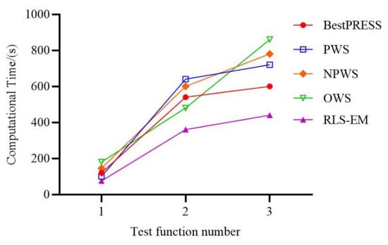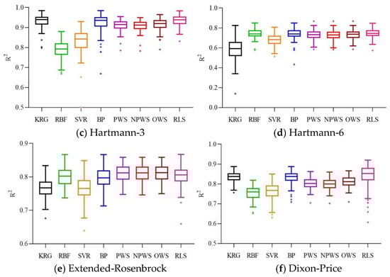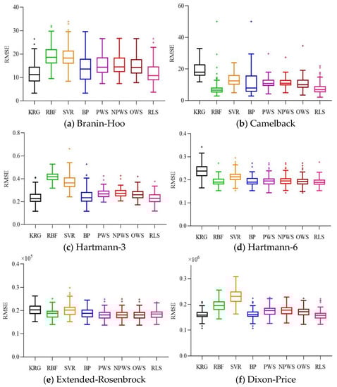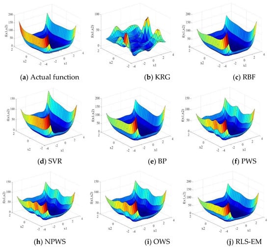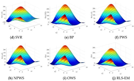 We implement the RLS-EM with MATLAB routines, the KRG model was based on a design and analysis of computer experiment toolbox named DACE [], the RBF model was developed by Sarra [], and the SVR model was based on the LIBSVM, a library for support vector machines, which was developed by Chang and Lin []. Four ensemble models including BP, PWS, NPWS, and OWS were implemented in the MATLAB toolbox developed by Viana []. The cases have been executed with MATLAB R2018a on a computer Intel (R) Core (TM) i7-8700K, CPU @3.7 GHz, 32.0 Gb RAM, 64 bits, and Windows 10.