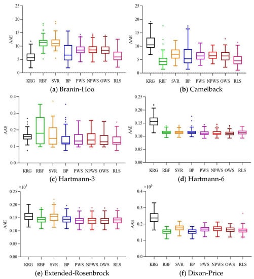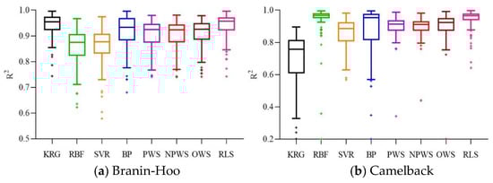 To validate the performance of the different surrogate models, 100 runs were executed for each of the numerical examples. The MATLAB routine “boxplot” was used for easy visualization and comparison. The three-dimensional surface plots of the Branin-Hoo and Camelback functions are shown in Figure 1 and Figure 2, respectively. The nine surface plots in Figure 1 show that each surrogate model fits the Branin-Hoo function well. However, Figure 2 shows that the different surrogate models have considerable differences in the Camelback function fitting. Despite the two functions being highly nonlinear, the RLS-EM can accurately approximate the actual functions. The boxplots of RMSE, AAE, and R2 for the different test functions are shown in Figure 3, Figure 4 and Figure 5; the mean and standard deviations of the different surrogate models for the performances are listed in Table 3. After 100 runs were executed, the mean and standard deviation of the RMSE, AAE, and R2 metrics for the numerical examples are shown in Table 3. For each metric of the numerical examples, the values to the left of the symbol “/” are the mean of the different models, and the values below are the standard deviations corresponding to the models. For the RMSE and AAE metrics, the smaller mean values indicate the better model accuracy, and the smaller standard deviation values show the better robustness. The R2 metric with a mean value is closer to one and a smaller standard deviation indicate a more accurate and more robust model.
