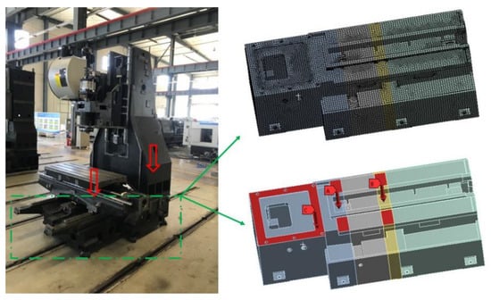 A CNC milling machine is mainly composed of a bed, column, slider, and toolbox among other components. The column and slider, under static conditions, exert a large force on the bed, which is expressed by the red arrows in Figure 7. When the milling machine is being operated, the bed is also affected by the milling impact from the toolbox. Since the deformation has a great influence on the milling precision, the design of the milling machine bed needs good resistance to the deformation; thus, it is very important to accurately predict the deformation during design.
