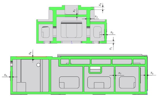 As the milling force is small, we only considered the column and slider weights applied to the milling machine bed, and we predicted the static deformation. The simplified structure of the bed is mainly controlled by eight variables, which are shown in Figure 8. The variables’ design space is set as x1 [40,60], x2 [40,60], x3 [50,80], x4 [40,60], x5 [20,40], x6 [20,45], x7 [15,30], x8 [50,80], and x9 [40,60]; all the variables are in millimeters. The force of the beam is 56.5 kN and that of the slider is 23.68 kN. The slider is positioned at the initial position of the bed. FEA simulations were carried out to obtain the sample set and the corresponding deformation values. An RLS-EM model was constructed to evaluate the deformation of the bed under the two forces, which are based on the variables with different size values. A total number of 200 sample points were selected for the construction and verification of the proposed ensemble model.