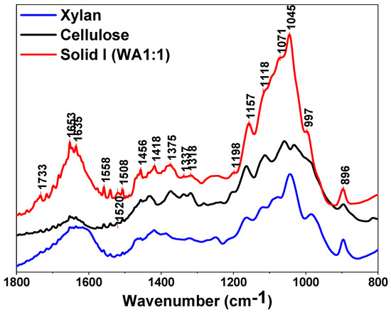 The spectra of Solid I, Solid II and references of commercial cellulose, xylan and lignin are displayed in the region between 1800 and 800 cm−1 in Figure 3 and Figure 4, respectively. The bands are assigned to the characteristic bending or stretching modes of different specific groups of lignocellulosic biomass in the “fingerprint” region. The peak structure of this region is quite complicated, but the peaks can be assigned as follows [60,61,62,63]: 1735 cm−1 indicates unconjugated C=O in xylans (hemicellulose); 1653 cm−1 indicates absorbed O-H and conjugated C-O in lignin; 1593 cm−1 and 1508 cm−1 indicate C=C skeletal vibrations (aromatic ring) in lignin; 1457 cm−1 and 1420 cm−1 indicate C-H deformation in lignin and carbohydrates; 1375 cm−1 indicates C-H deformation in cellulose and hemicellulose; 1336 cm−1 and 1318 cm−1 indicate C-H vibration in cellulose and C-O vibration in syringyl derivatives; 1264 cm−1 indicates guaiacyl ring breathing, C-O stretching in lignin and C-O linkages in guaiacyl aromatic methoxyl groups; 1157 cm−1 indicates C-O-C vibration in cellulose and hemicellulose; 1118 cm−1 indicates aromatic skeletal vibration; 1085 and 1035 cm−1 indicate C-O deformation in aliphatic ether and guaiacyl aromatic methoxyl groups, respectively; 1048 cm−1 indicates C-O stretching in cellulose and hemicellulose; and 896 cm−1 indicates C-H deformation in cellulose [60,61,62,63].