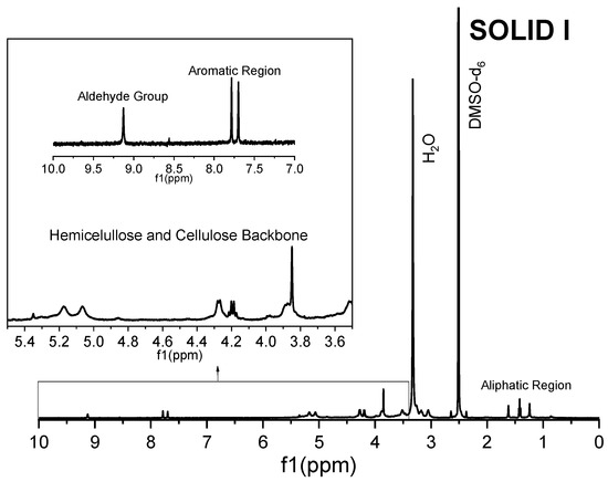 The Solid I and Solid II samples were analyzed by 1H magnetic resonance in DMSO-d6 solution and were compared with commercial reference materials of cellulose, xylans and lignin (Figure 5, Figure 6, Figure 7, Figure 8 and Figure 9). The spectra of Solid I and Solid II are very different.