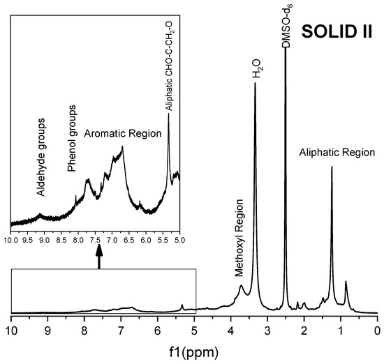 The 1H spectra of Solid II (Figure 8) and commercial lignin (Figure 9) are quite similar. In both spectra, signals appear at 9.2 ppm, corresponding to the strong shielding among guaiacyl groups, although a greater intensity is observed in the 1H spectrum of Solid II than that of the reference lignin. Methoxyl group protons are in the region of 4.0–3.4 ppm, very close to the water protons of aldehyde groups. signals in the region of 8.5–8.0 ppm correspond to the phenolic hydroxyl protons of lignin, and in the range of 8.0–6.0, the observed proton signals belong to the aromatic rings and vinyl protons of syringyl and guaiacyl. In the range of 6.0–4.0 ppm, signals of protons belonging to α, β, and γ saturated carbons of β-O-4, β-5 and β-β linkages appear because the lignin and Solid II are not completely dry and the DMSO-d6 is not 100% pure [66,67]. Finally, in the range of 2.0–1.0 ppm, the signals correspond to CH2, the aliphatic protons belonging to methyl or methylene groups, while the signals between 1.0 and 0.8 ppm were attributed to the protons in saturated aliphatic chains in lignin [66]. In summary, Solid II is essentially lignin. These observations are in agreement with the IR characterization: Solid I is a carbohydrate-rich solid with a small amount of lignin, and Solid II is essentially lignin.