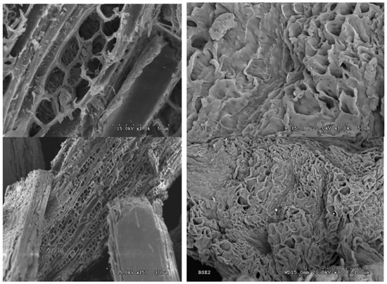 Solid I and raw barley straw were analyzed by SEM. The micrographs show a large difference between the starting sample and the precipitated sample (Figure 11). The sample of original barley straw (Figure 11) shows a regular structure typical of the vascularization of straw. However, the Solid I sample (Figure 11) lost practically all of its vascular structure. In addition, the images with higher magnification indicate that the treated sample was more porous than the original. These morphological changes are compatible with the structural changes observed in X-ray diffraction. The structure of the starting biomass was modified, giving rise to a more amorphous structure, which favors accessibility to the biomass components, making the material easier to transform. Destruction of the structure of lignocellulosic biomass has been observed in previous works [47] by other authors [69] and with other pretreatments [70].