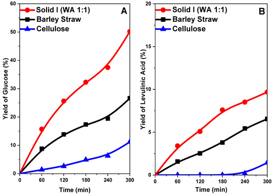 In Figure 12A, the yield of glucose decreases in the following order: Solid I > original barley straw > cellulose. Cellulose gave a very low yield of glucose (11%) after 5 h of reaction. The barley straw sample gave a higher yield of approximately 30%. However, with the Solid I sample, a yield of 65% was reached, which substantially affects acid hydrolysis to sugars. These glucose yield values follow an order inverse to that of sample crystallinity, as shown in Figure 10. This is because greater crystallinity (order) hinders the breakdown of the ß(1→4)-d-glucosidic bonds of cellulose because they are less accessible. However, treatment that reduces the crystallinity and increases the accessibility of said bonds favors hydrolysis, giving rise to higher yields of glucose [33,34,46,71].