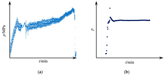 (a) Fracturing curve of CO2 fracturing; (b) fracturing curve of traditional hydraulic fracturing.
