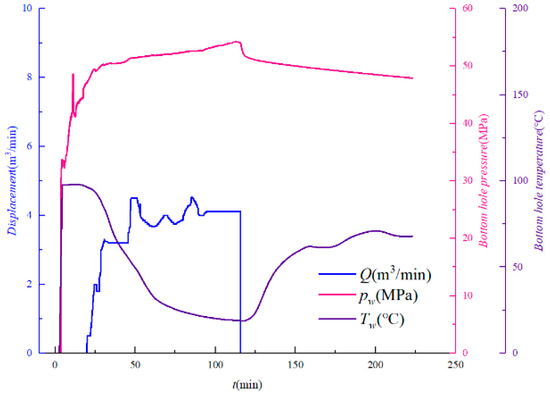 The original parameters used in the model are shown in Table 1, and the wellbore configuration is shown in Figure 3. All above conditions are from a well which actually conducted CO2 fracturing in the Sulige gas field Sudong block. The measured data at the bottom hole, such as injecting displacement, bottom hole pressure, and bottom hole temperature, are exhibited in Figure 4. In order to match the actual CO2 fracturing, tubing and annulus synchronous injection is applied as the injection mode during the calculation in this paper, noted as casing injection.