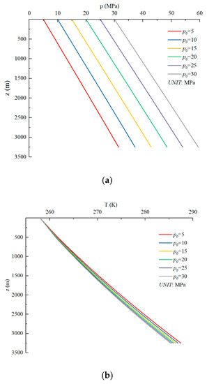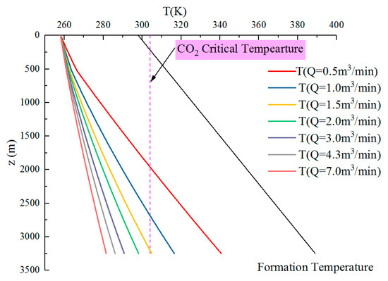 Previous studies have shown that displacement [27] is the key factor affecting temperature and pressure of CO2 in the wellbore. The calculations of wellbore temperature and pressure distributions under difference displacement are shown in Figure 5 and Figure 6.