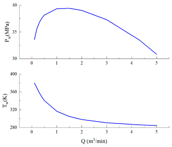 The effect of injection pressure on pressure and temperature distribution during CO2 fracturing is shown in Figure 12. The increase of injection pressure would lead to a rise of the whole wellbore pressure and the pressure gradient remains unchanged according to Figure 12a. As exhibited in Figure 12b, the whole wellbore temperature reduces as injection pressure increases, but the change is very small.
