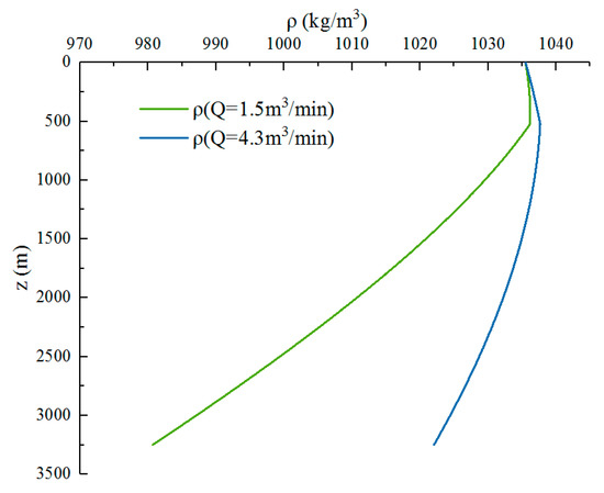 CO2 density and viscosity profiles are illustrated by Figure 9 and Figure 10. It can be seen from the diagrams that the trends of the density and viscosity of CO2 in the wellbore are matching. The density and viscosity of CO2 both tend to rise first and then reduce along the flow direction under different displacement, and the density and viscosity under the displacement of 1.5 m3/min are lower than those under the displacement of 4.5 m3/min. This is related to the undulation of heat exchange and flow friction caused by displacement increasing.