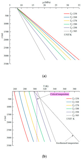 Effect of geothermal gradient: (a) CO2 pressure profile; (b) CO2 temperature profile.