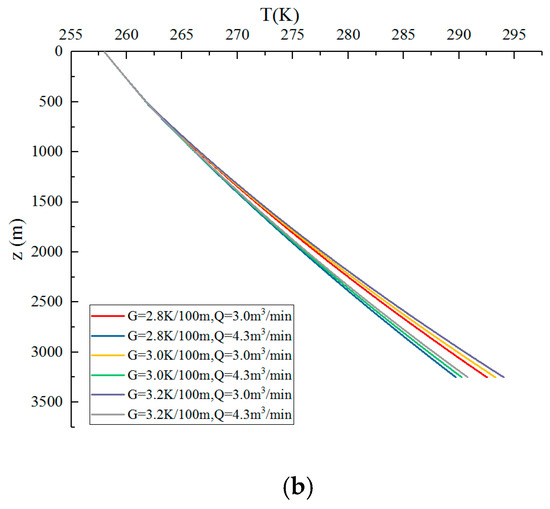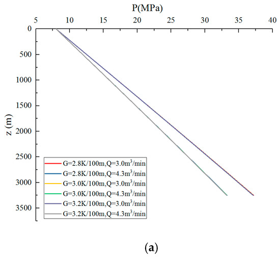 Figure 13 presents the influence of the geothermal gradient on the pressure and temperature distribution in the process of CO2 flow in the wellbore. As can be seen in Figure 13, there is little impact of geothermal gradient on wellbore pressure. Although wellbore temperature increases with the increase of geothermal gradient, as shown in Figure 13, the increase is not obvious. The reason for this phenomenon is that higher displacement will weaken the heat exchange between the stratum and CO2 in the wellbore, and the temperature increment caused by geothermal gradient needs to be accumulated with well depth, which makes the increase of fluid temperature in the wellbore insufficient to change the wellbore pressure.