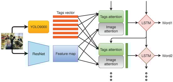 Figure 3 shows the overview of our model. From a given image, tags and regional features are extracted by two models (YOLO9000 and Faster R-CNN, respectively). Each kind of features is processed through an attention module to produce local features that represent the part the model is currently focused on. The two local features are combined and fed into an LSTM model [] to generate the probabilities of the words in the vocabulary set at each time step. The generated results are processed with a beam search strategy to choose the best candidate caption.