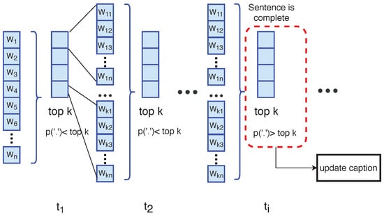 From the scores of the sequences, we choose the next top k for the next time step. Unlike beam search strategy in some other methods, beside choosing the sequence with the highest score to be the final candidate, we apply a heuristic to adjust the result. Choosing the sequence with the highest score may lead to an incomplete sentence because longer sentences get lower scores due to more multiplication. To avoid this, we use the probability of the <END> character to select the final candidate. If the probability of the <END> character is in the top k, we consider that sequence could be a complete sentence. If the current candidate is an incomplete sentence, it is immediately replaced by the new sequence that has high probability of the <END> character. If both are complete sentence, the scores are compared to choose the better candidate. With this heuristic, our model favors complete sentence over incomplete ones. Additional our previous work [], in this work, we add one more heuristic to favor long sentences over short sentences because longer sentence can describe more details than a shorter one. We apply the formula in [] to adjust the score at each time step. Concretely, we divide the score with the length normalization score so that the scores of long sentences do not reduce rapidly due to the multiplication of small numbers. The length normalization is computed as follows: