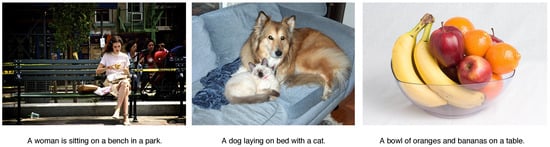- Farhadi, A.; Hejrati, M.; Sadeghi, M.A.; Young, P.; Rashtchian, C.; Hockenmaier, J.; Forsyth, D. Every Picture Tells a Story: Generating Sentences from Images. In Proceedings of the 11th European Conference on Computer Vision: Part IV, Crete, Greece, 5–11 September 2010; Springer: Berlin/Heidelberg, Germany, 2010; pp. 15–29. [Google Scholar]