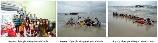 Visual format has the most potential because it is rich in information and easy to collect. However, raw visual data consume large storage capacity and it is difficult for users to conduct a query of a specific event. When retrieving a certain event, large amount of images needs to be analyzed to find the matching image. One common approach is breaking the image into set of entities appear in the image using different object detectors [,]. Another approach is to describe the content of the image into text format []. Retrieving based on text format is a lot easier than visual format. Therefore, we propose a framework that can generate description in text format from images taken from wearable cameras. Given an image taken from users’ device, the image is then processed into a sentence that describes the content of the image. In other words, the data in visual format are transferred into text format but still maintain the information. Users can easily retrieve the information they need via simply text retrieval method. Furthermore, text format will also reduce the consumption of storage capacity. This helps save resources as well as increases the amount of events that can be kept.