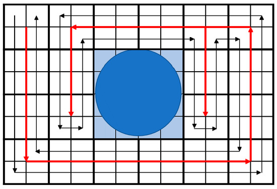 In Figure 1, the obstacle is at the center, and cells marked with blue color are considered part of the obstacle, so a robot will not cover these cells. The starting point is the top left cell. The spanning tree is shown with dark arrows. Furthermore, the expansion of the spanning tree is shown with red arrows. And the actual trajectory of the robot is represented by the thin, black arrows.