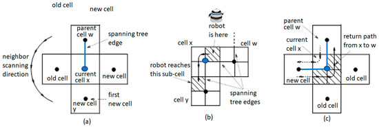 (a) Counterclockwise scanning of four neighbors. (b) a move from x to a new cell y. (c) a return from x to a parent cell w.
