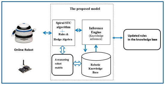 The proposed Hybrid Spiral Spanning Tree Coverage-Hedge Algebras model in Knowledge Reasonings for Robot Coverage Path Planning is designed to achieve improvements to the Spiral STC algorithm, combined with fuzzy rules in order to find optimal CPP areas. To find an optimal path, avoid obstacles, and maximize coverage, a robot can apply its rules in the knowledge base. The proposed model for Robot Coverage Path Planning is as shown in Figure 4.