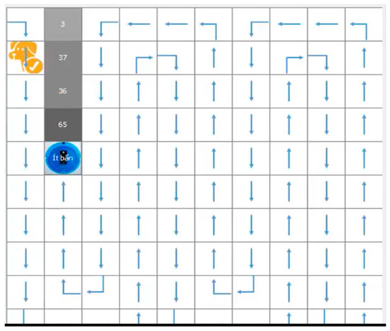 In our experimental evaluation of the proposed model, we have evaluated a number of path planning case studies in both experimental simulation results and real robot. Our proposed model has been applied to the same conditions and mapping in the range of cell numbering nodes (80–450). In simulation results, we can adjust the numbers of nodes that the robot traveled, and the considered rules when a robot faces moving and static obstacles. The interface of the algorithms has been tested in simulations, as shown in Figure 5, Figure 6 and Figure 7. Figure 5 shows the beginning of an experimental interface. Figure 6 shows the robot path visited for the proposed model with static obstacles, where there are no moving obstacles. Figure 7 shows the robot path visited for the proposed model where there are moving obstacles.