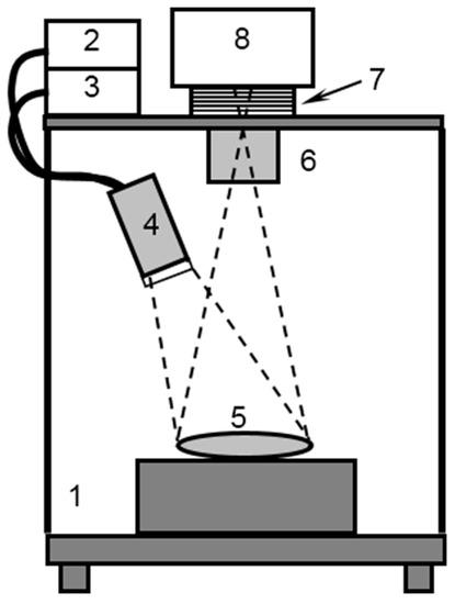 Schematic of the experimental setup for fluorescence imaging: 1—dark chamber, 2,3—laser sources 690 and 785 nm, 4—optical diffusor, 5—experimental object, 6—objective lens, 7—filter wheel, 8—CCD.