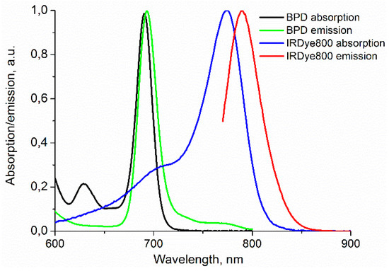 Targeted nanoconstructs are a modern type of PS carrier that combine the drug itself with additional complexes, ensuring targeted delivery, and contrasting agents, providing high sensitivity for monitoring techniques. Employment of benzoporphyrin derivative (BPD), a clinically approved photosensitizer, as a component of a nanoconstruct can significantly enhance the efficiency of photodynamic therapy against cancer cells, due to the red-shifted absorption peak (λex = 690 nm), fast accumulation, and rapid excretion [12,13,14]. However, the excitation spectral band in the visible range and relatively low fluorescence quantum yield of BPD [15] limit the abilities of fluorescence imaging at large depths. This aspect requires the introduction of an additional contrasting agent as a component of a nanoconstruct. Infrared fluorescence marker IRDye800 is a potential candidate for complementary use with BPD in nanoconstructs, owing to its higher fluorescence brightness and the excitation spectrum shifted to the near-IR spectral range [16].
