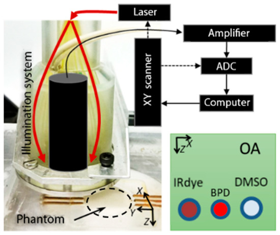 The OA imaging setup (Figure 3) employed the concept of dark-field acoustic resolution photoacoustic microscopy (AR-PAM) [20], where the scanning OA head is represented by a conical fiber-optic illumination system (CeramOptec, Germany) combined with a spherically focused acoustic detector made of a polyvinylidene difluoride (PVDF) piezo film with a 25 μm thickness (IAP RAS, Russia) [21]. The ultrasound antenna with a numerical aperture of 0.6 and a receiving band of 35 MHz provided a spatial resolution of 40 μm at a probing depth of up to 3 mm. For probing, a tunable 2214PC laser (LOTIS-TII, Belarus) with a wavelength range of 410–2100 nm, pulse duration of 18 ns, and pulse repetition rate of 10 Hz was used. OA imaging was performed at the probing wavelengths of 690 nm and 785 nm, corresponding to the optical absorption peaks of BPD and IRDye800. Scanning was performed by two M-664 one dimensional positioning stages (PIMicos, Germany). OA A-scans from individual laser pulses were digitized by a 16 bit ADC Razor 16 (GaGe, USA) with a 200 MHz sampling rate. Raw OA A-scans were processed using a digital 50MHz low-pass filter, and the resulting raw OA B-scans were reconstructed based on the synthetic aperture technique [22].