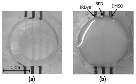The tube embedding depth in the phantom was about 1 mm. To localize the position of the tubes with respect to the entire phantom, bimodal imaging of the tubes filled with solutions of IRDye800, BPD, and DMSO was also performed prior to agar mixture pouring. Figure 3 shows the photos of the phantom filled with water (Figure 4a) and with agar mixture (Figure 4b). Preparation of tissue mimicking phantoms, their characterization, and comparison with real biotissues are described in details in previous papers [8,25,26]. Optical properties of the employed agar mixture and their comparison to the values for murine brain ex vivo are summarized in Table 1. Here, µa is the absorption coefficient and µs’ = µs(1−g) is the reduced scattering coefficient, where µs is the scattering coefficient and g is the scattering anisotropy factor.