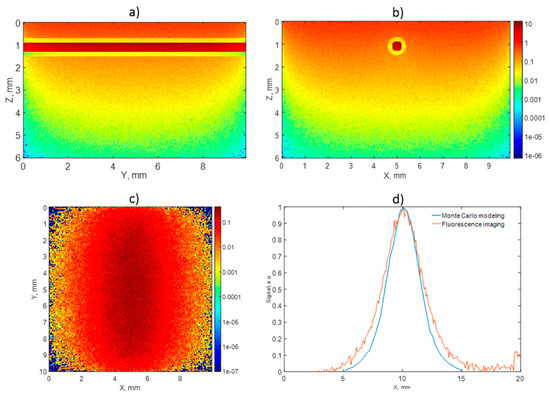 In order to approve the relevance of the obtained fluorescence images, Monte Carlo simulations were performed for the geometry corresponding to that of the agar mixture phantom. Figure 7 depicts the results of the simulations for the phantom with an embedded BPD tube for the probing wavelength of 690 nm. The top row of Figure 7 demonstrates the distribution of the probing radiation absorption within the medium. The maps demonstrate photon fraction absorbed per unit volume, normalized by the number of launched photons per unit area. One can see that the absorption within the BPD tube was quite uniform, confirming that the registered fluorescence response originated from the entire labeled volume. Figure 7c demonstrates the simulated fluorescence image, while Figure 7d shows the simulated and experimentally registered central cross-sections of the fluorescence profile. The calculated fluorescence map shows the ratio of densities of fluorescence photons that reached the top surface of the medium to the number of launched photons; fluorescence quantum yield was taken to be equal to 1. Similar results were obtained for the FL of the phantom with the embedded IRDye800 tube for the probing wavelength of 785 nm (not shown).