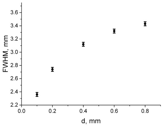 Figure 8 demonstrates the widths of the fluorescence profile central cross-sections for different diameters of the labeled tubes. The demonstrated monotonous dependence of FWHM on the tube size confirms that complementary bimodal imaging allows to obtain additional information on the size of the nanoconstruct-containing volume based on a given depth which can be determined from OA measurements. Note that the value of the fluorescence profile FWHM calculated for the tube with the inner diameter of 0.5 mm and located in a turbid phantom at the depth of 1 mm is FWHM = 3.3 mm which completely agrees with the corresponding value given in [18].